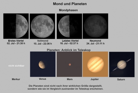 Unser Erdtrabant zeigt sich uns am Monatsanfang als zunehmender Halbmond und lässt uns am 10. Juli eine weitere kurze Vollmondnacht erleben. Am Morgen des 16. Juli ist vor der Morgendämmerung ein naher Vorübergang des abnehmenden Mondes am Ringplaneten Saturn zu verfolgen. Wenn am Morgen des 22. Juli die Mondsichel nordöstlich von der strahlenden Venus steht, erweitert der noch unauffällige, weil horizontnah stehende Jupiter das Duo zum Trio. Dazu gesellen sich der rötliche Stern Aldebaran im Sternbild Stier sowie der gelbliche Stern Capella im Sternbild Fuhrmann. Am folgenden Morgen bietet die sehr schmale abnehmende Mondsichel ihre letzte Morgensichtbarkeit. Sie steht dann nördlich vom erstmals wieder in der Morgendämmerung auftauchenden Jupiter über dem nordöstlichen Horizont. Nach Neumond am 24. Juli bietet die jetzt schmale zunehmende Mondsichel zwei Abende später ihre erste Abendsichtbarkeit. Am 28. Juli passiert dann die dickere Mondsichel südlich den Planeten Mars, der vielleicht nur noch mit Fernglas wahrgenommen werden kann.
