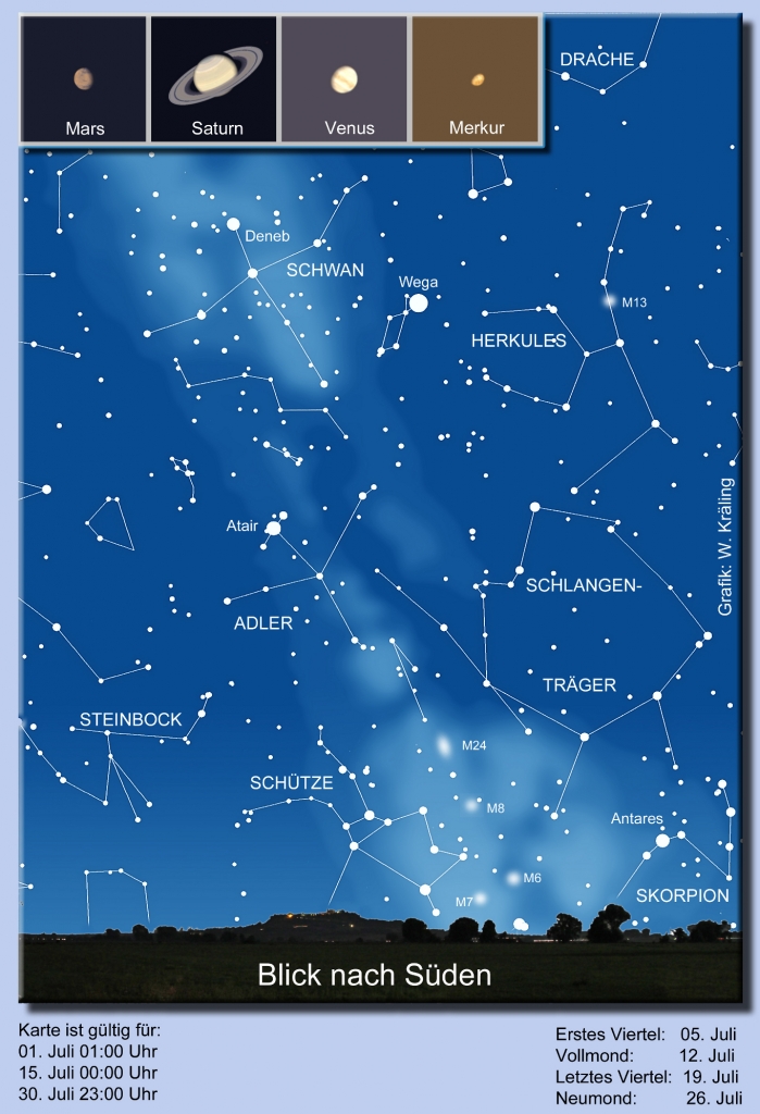 Merkur lässt sich ab Monatsmitte bis in die letzten Monatstage vor fünf Uhr, am besten im Fernglas, am Morgenhimmel flach über dem Horizont im Nordosten erspähen. Der Planet Venus erscheint in diesem Monat weiterhin mehr als eine Stunde vor der Sonne in der hellen Morgendämmerung über dem Horizont. Am 02. Juli läuft sie nördlich am hellen Stern Aldebaran, der wohl nur im Fernglas erfasst werden kann, vorbei. Der beleuchtete Teil der kleinen Venusscheibe nimmt auf über 90% zu. Mars im Sternbild Jungfrau steht abends hoch im Südwesten und geht am 12. Juli zum dritten Mal in diesem Jahr nördlich an Spica vorbei. Der Abstand hat sich verringert, was auf die Schleifenbewegung während der Oppositionsperiode zurückzuführen ist. Beobachtungen des kleiner werdenden Marsscheibchens mit Amateurteleskopen bieten noch einige Oberflächendetails. Da Jupiter am 24. Juli von der Sonne überholt wird, bleibt er den ganzen Monat für das bloße Auge unsichtbar. Dagegen ist der Ringplanet Saturn weiterhin ein wunderbares Beobachtungsobjekt, das allerdings Ende des Monats schon um Mitternacht unter dem Horizont verschwindet. Die günstigste Zeit zur Beobachtung beginnt sofort nach dem Dunkelwerden. Dann lässt sich im Teleskop das eindrucksvolle Ringsystem mit der auffälligen dunklen Cassinischen Teilung bewundern sowie der Umlauf der fünf helleren Saturnmonde verfolgen.