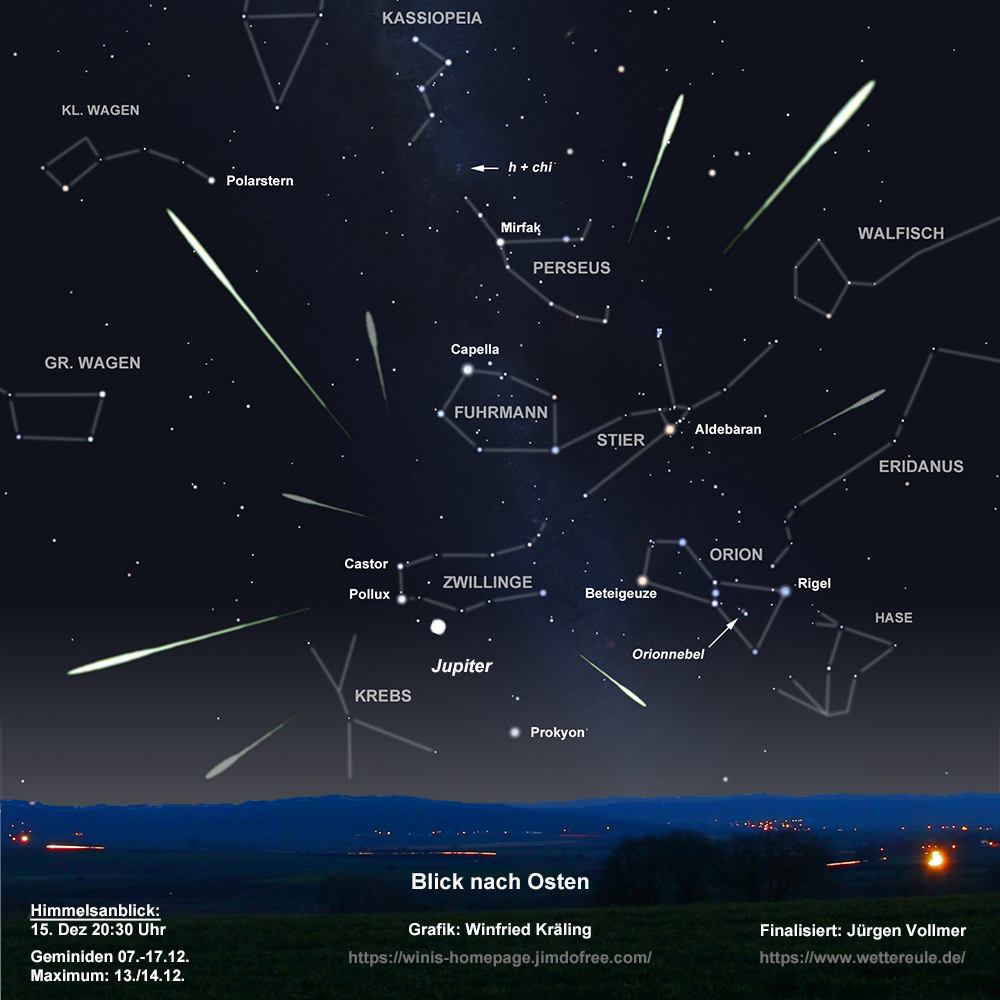 Geminiden In diesem Monat können bei klarem Himmel „Sternschnuppen“ aus zwei Meteorströmen beobachtet werden. Zum einen sind dies mit einem Maximum in der Nacht vom 13. auf den 14. Dezember die Geminiden, die zum stärksten Strom des Jahres gehören und praktisch ab  20 Uhr aus dem Sternbild Zwillinge während der ganzen Nacht verfolgt werden können. Die Zusatzgrafik zeigt den Ausgangspunkt, den sogenannten Radianten der aufleuchtenden, mittel schnellen Zerfallsprodukte des Asteroiden (3200) Phaethon, der neuerdings als ein ausgegaster Komet betrachtet wird.  Zum anderen sind es die Ursiden mit einem Maximum am Morgenhimmel des 22. Dezember, die scheinbar aus einem Bereich um den Polarstern herum aufleuchten.