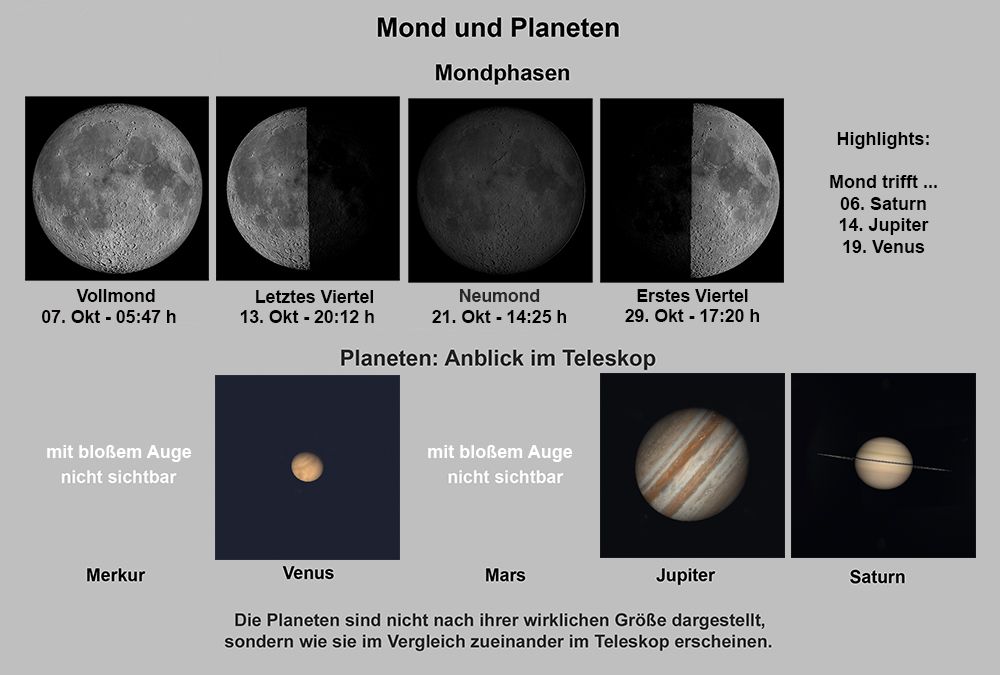 In der langen Nacht vom 5. auf den 6. Oktober wandert der fast volle Mond nördlich am Ringplaneten Saturn vorbei. In klaren Nächten um den Oktobervollmond am 7. Oktober kann man die brünftigen Hirsche in unseren Wäldern röhren hören. Am Morgenhimmel des 14. Oktober findet man den abnehmenden Halbmond zwischen dem Riesenplaneten Jupiter und den beiden hellen Sternen Castor und Pollux im Tierkreissternbild Zwillinge über dem Nordosthorizont. Schließlich steht die abnehmende Sichel mit dem erkennbaren Erdschein auf der nicht beleuchteten Mondoberfläche am Morgen des 19. Oktober gegen 6:30 Uhr über dem Osthorizont nahe beim „Morgenstern“ Venus.