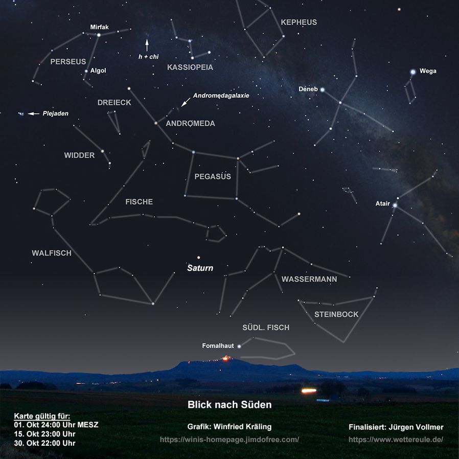 Der Sternhimmel zeigt mit dem hellen orangefarbenen Arktur Reste des Frühlingsdreiecks im Nordwesten. In bester Beobachtungsposition dominiert in Südrichtung das „Sommerdreieck“ aus den hellen Sternen Wega, Deneb und Atair in und nahe dem auffälligen Sternenband der Sommermilchstraße. Der Osthimmel zeigt mit dem „Herbstviereck“ aus Sternen der Sternbilder Pegasus und Andromeda typische Herbststernbilder. Der östliche Stern in der Andromedakette, Alamak, ist ein interessanter “Doppelstern“ in etwa 370 Lichtjahren Entfernung. Die hellere Komponente erscheint orange, die schwächere dagegen blauweiß. Auf den Andromedanebel M 31 mit den beiden leicht auffindbaren Begleitgalaxien sei hier nur der Vollständigkeit halber hingewiesen.